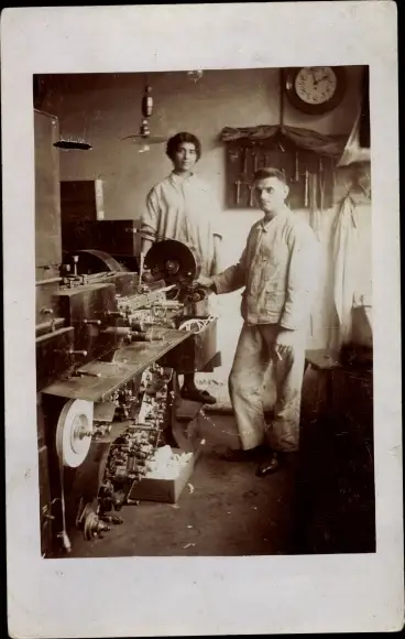 Foto Ak Handwerker in der Werkstatt, Schleifmaschine?