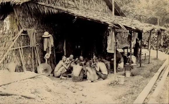 Foto Ak Indonesien, Männer beim Essen, Wohnhaus