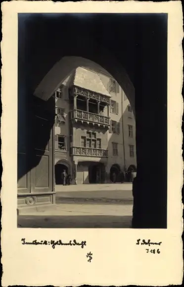 Foto Ak Innsbruck in Tirol, Blick auf das Goldene Dachl durch einen Torbogen