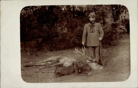 Foto Ak Jäger, Jagdbeute, Erlegter Hirsch, Jagdhund