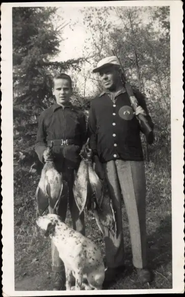 Foto Ak Jäger mit Jagdbeute, Erlegte Vögel, Jagdhund