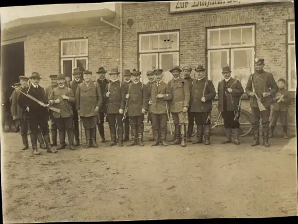 Foto Ak Jagdgesellschaft vor einem Gasthof, Zur Dithmarsch...