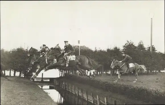 Foto Ak Jockeys zu Pferde, Sprung über Fluss, Hürde, Springreiten