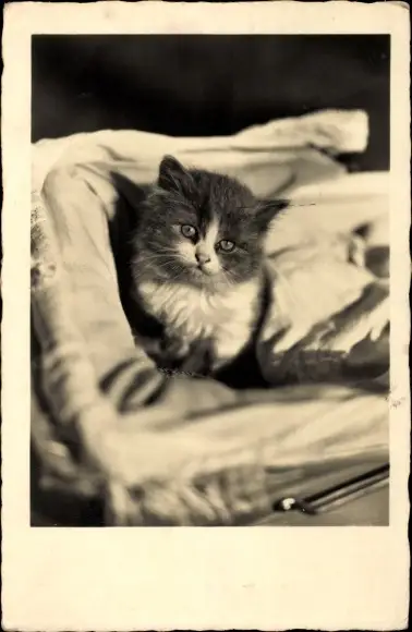 Foto Ak Junge Katze in einem Puppenwagen