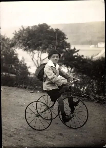 Foto Ak Junge auf einem Dreirad