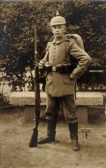 Foto Ak Junge in Uniform, Kaiserlicher Soldat, Portrait, Pickelhaube, Gewehr