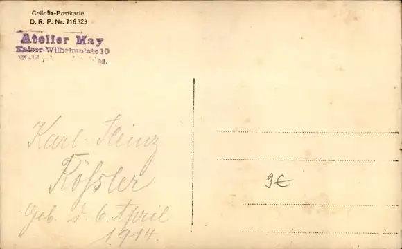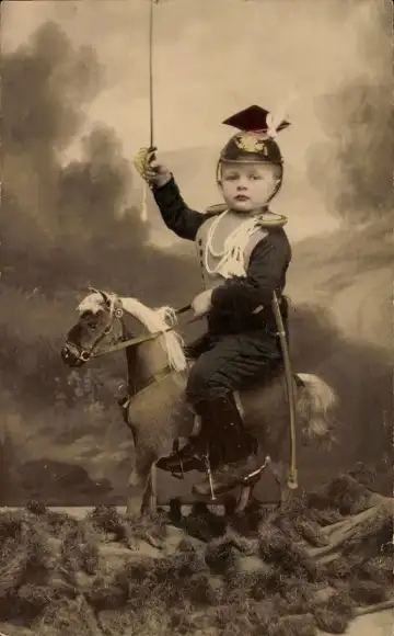Foto Ak Junge in Uniform auf einem Schaukelpferd, Portrait, Karl Heinz Rössler