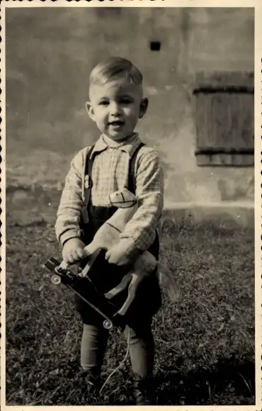 Foto Ak Junge mit Spielzeug, Portrait, Pferd