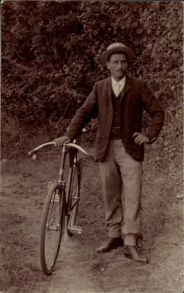 Foto Ak Junger Mann mit Fahrrad, Wald, Radfahrer