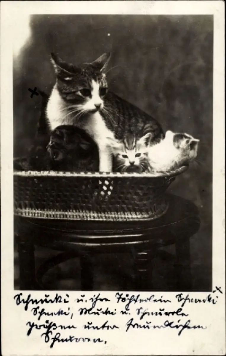 Foto Ak Katze mit jungen Katzen in einem Korb, Schnucki