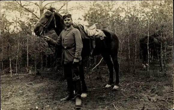 Foto Ak Kavallerist posiert mit Pferd im Wald