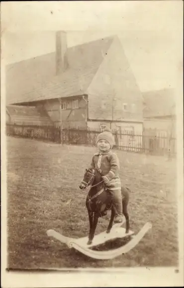 Foto Ak Kind auf einem Schaukelpferd, Portrait