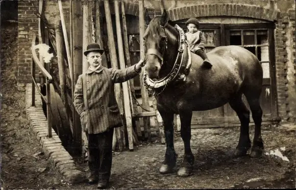 Foto Ak Kleines Kind auf einem Zugpferd sitzend, Mann