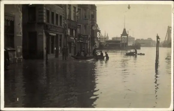 Foto Ak Köln am Rhein, Straßenpartie bei Hochwasser, Boote