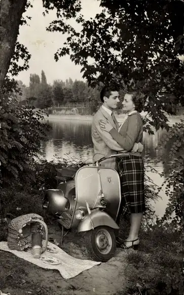 Foto Ak Liebespaar macht Picknick, Umarmung, Motorrad