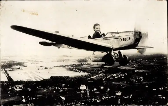 Foto Ak Mädchen in einem Flugzeug, Fotomontage