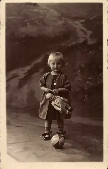 Foto Ak Mädchen mit Puppe, Ball, Portrait