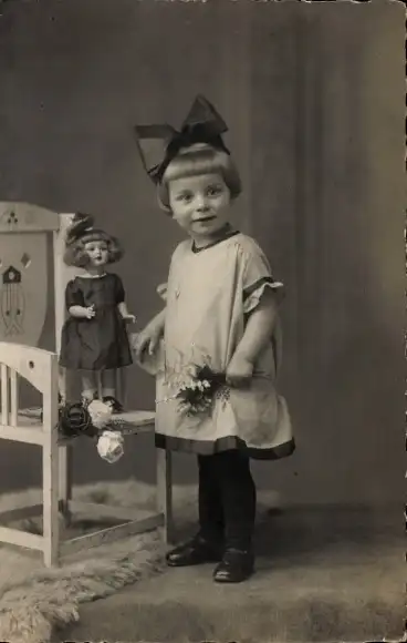 Foto Ak Mädchen mit Puppe, Portrait, Stuhl, Spielzeug