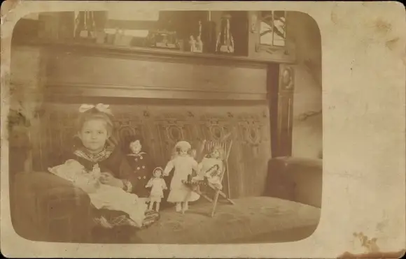 Foto Ak Mädchen mit Puppen auf einem Sofa