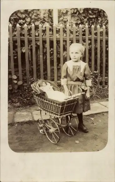 Foto Ak Mädchen mit Puppenwagen, Puppe, Zaun