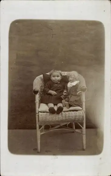 Foto Ak Mädchen und Puppe, Portrait, Stuhl