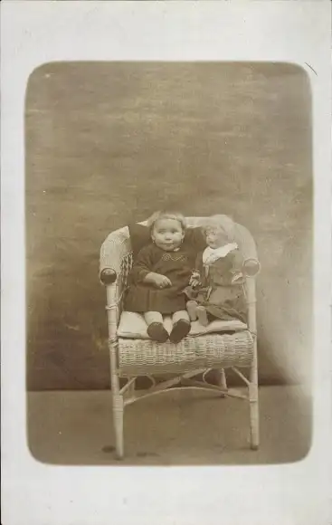 Foto Ak Mädchen und Puppe, Portrait, Stuhl