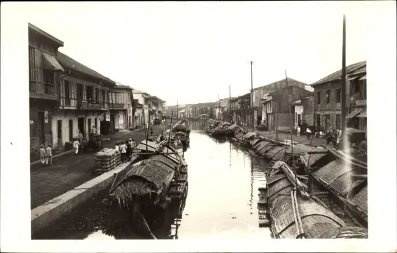 Foto Ak Manila Philippinen, Kanal, Straßenpartie, Boote