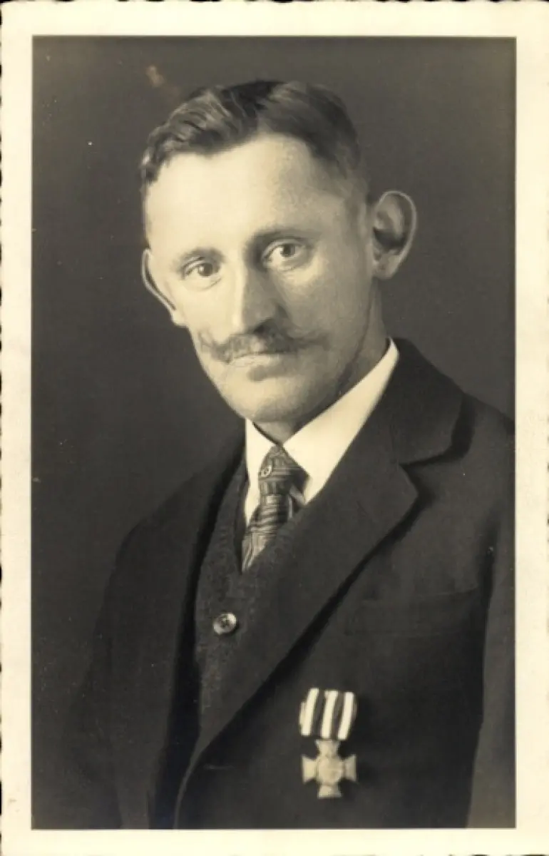 Foto Ak Mann in schwarzem Anzug, Abzeichen