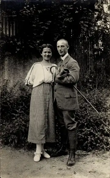 Foto Ak Mann mit Gehstock und Frau in einem Garten, Portrait