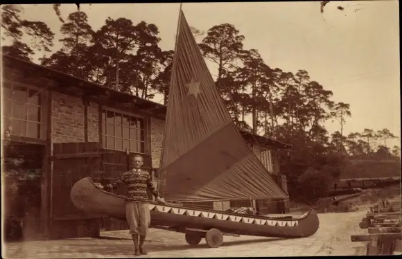 Foto Ak Mann mit Kanu mit Segel