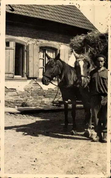 Foto Ak Mann mit Pferden, Pferdefuhrwerk