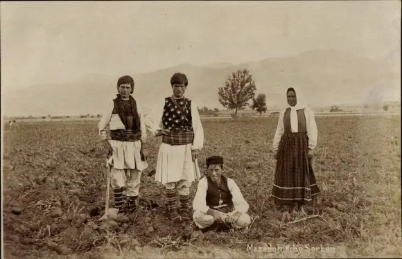 Foto Ak Mazedonische Serben, Personen in Trachten auf einem Feld