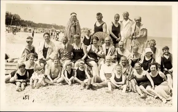 Foto Ak Menschen am Strand, Bademode, Urlauber, Gruppenbild