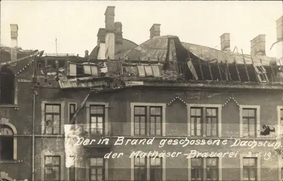 Foto Ak München, Brauerei, Dachstube, Brand 1919