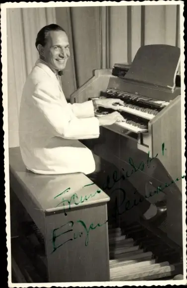 Foto Ak Musiker Eugen Reimann an der Heimorgel, Autogramm