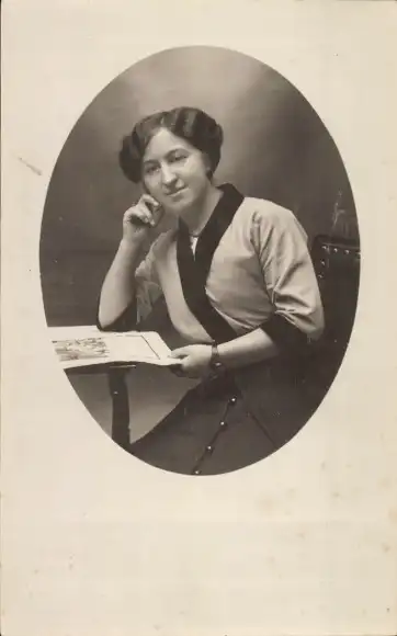 Foto Ak Nachdenkliche Frau am Schreibtisch