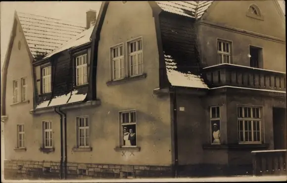 Foto Ak Neunkirchen im Saarland, Partie an einem Haus, Frauen am Fenster