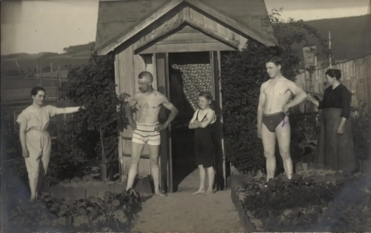 Foto Ak Neustadt in Sachsen, Familie vor einer Gartenlaube, Schrebergarten, Bademoden