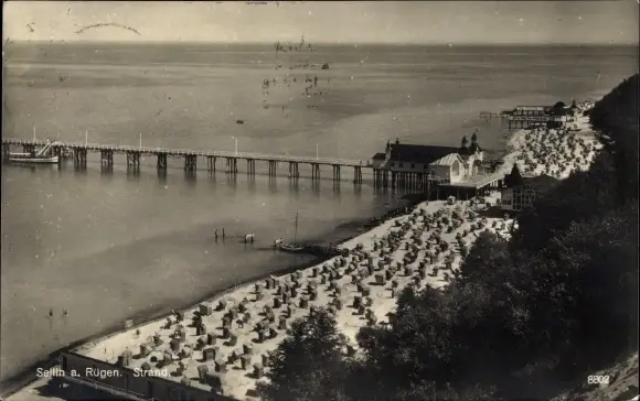 Foto Ak Ostseebad Sellin auf Rügen, Strand, Seebrücke
