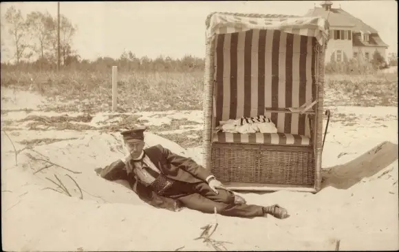 Foto Ak Ostseebad Timmendorfer Strand, Mann am Strand, Strandkorb