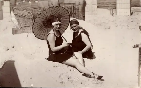 Foto Ak Ostseebad Zinnowitz auf Usedom, Frauen am Strand, Sonnenschirm, Bademode