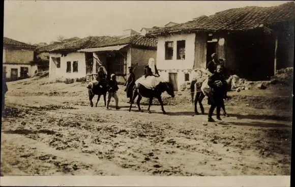 Foto Ak Partie aus einer balkanischen Ortschaft, Bauern, Esel, Wohnhäuser