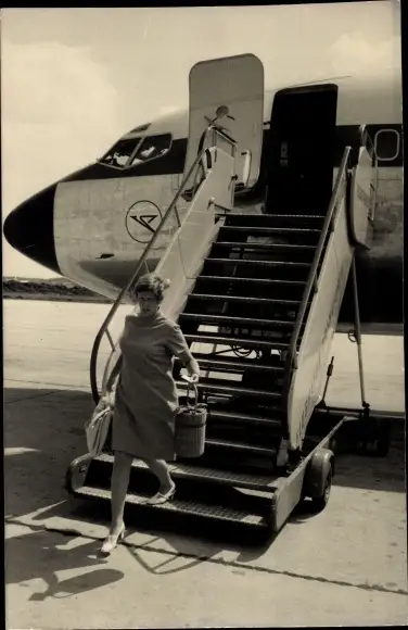 Foto Ak Passagierflugzeug, Frau auf einer rollbaren Treppe