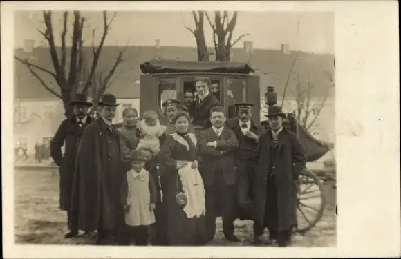 Foto Ak Personen vor einer Postkutsche