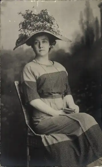 Foto Ak Porträt einer Frau, Hut mit Blumen, Stuhl
