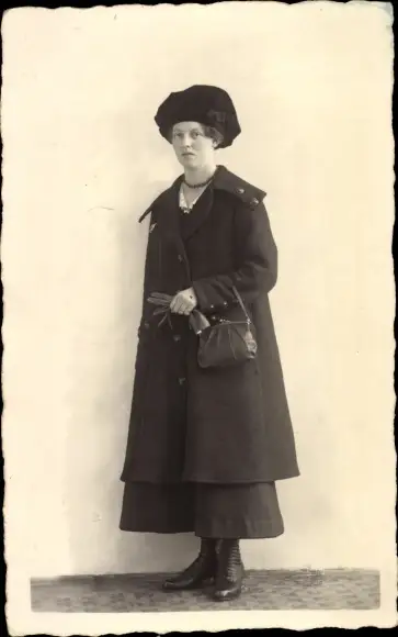 Foto Ak Portrait einer Frau in schwarzem Mantel, Mütze, Handtasche, Handschuhe