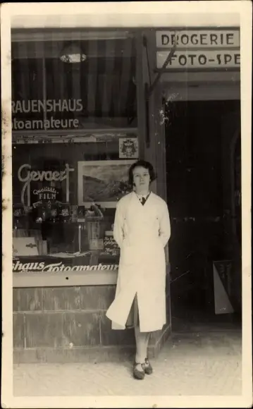 Foto Ak Portrait einer Frau vor Drogerie-Laden, Handel