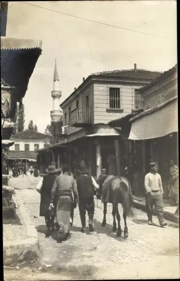 Foto Ak Prilep Mazedonien, Straßenpartie, Passanten, Pferd, Minarett