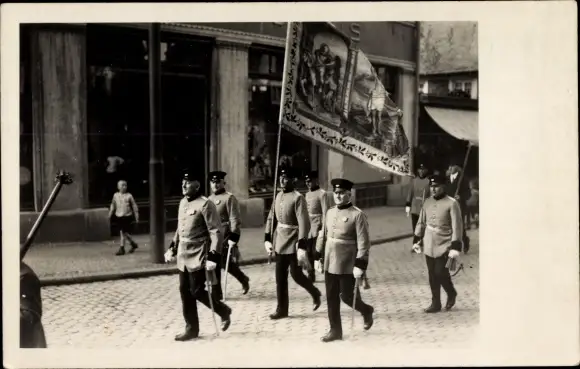 Foto Ak Prozession, Männer in Uniformen, Fahne mit Jesus, 1931