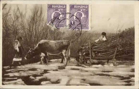 Foto Ak Rumänien, Fuhrwerk, Kuh, Frauen, Holz-Transport